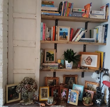 Transform your shelves with upcycled finds and hand-painted accents that create a balanced and inviting display.