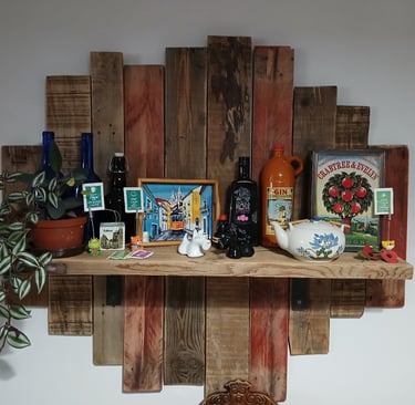 Wooden wall feature made with recycled pallets and scaffolding board.